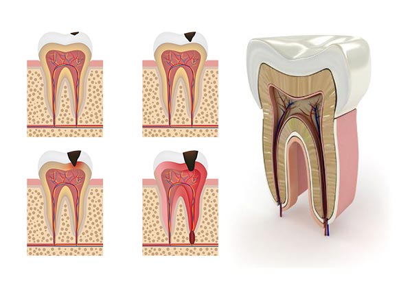 “Endo” means “inside”, and endodontics – another term for root canal treatment – is the area of dentistry concerned with the inner tooth. Under the tooth’s two hard outer layers – enamel and dentine – lies the tooth pulp, a collection of blood vessels, nerves and connective tissue, crucial to early tooth development. When cavities, gum disease or tooth decay set in, or an injury occurs, the pulp can become infected. Root canal treatment involves the removal of the pulp, followed by filling and restorative dental work.